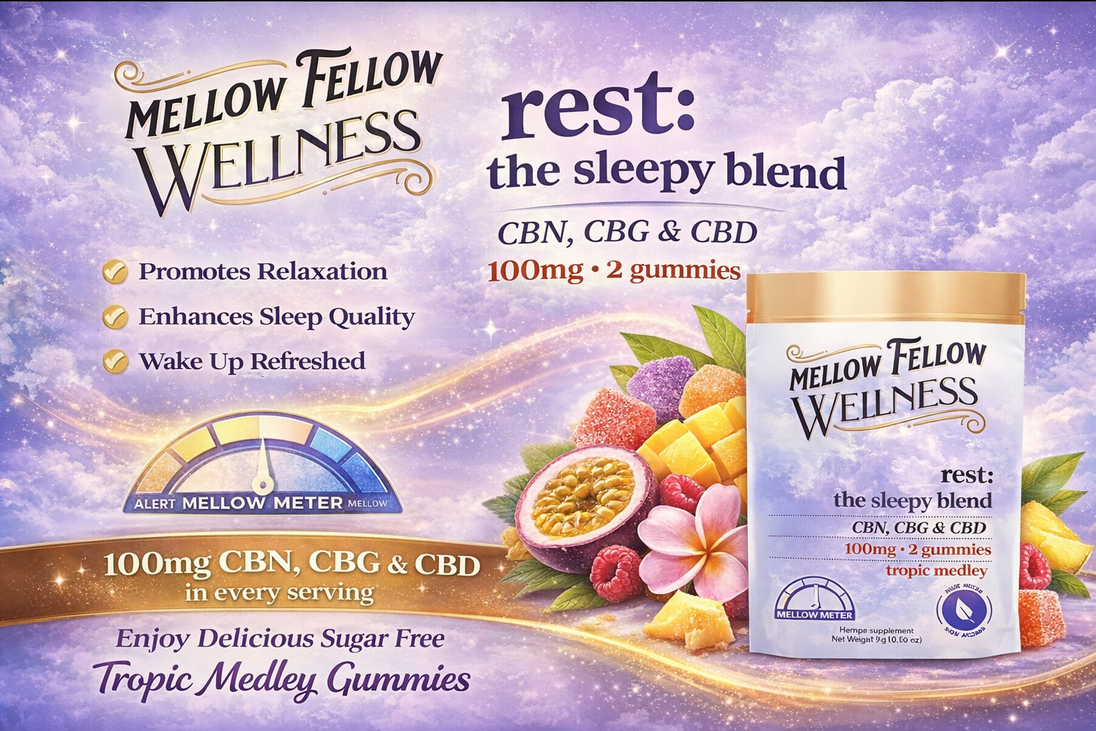 Vita Mellow Fellow Wellness Rest Blend 100MG Gummies 2Pc/PK 30CT Tropical Medley